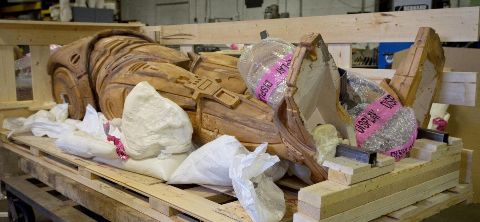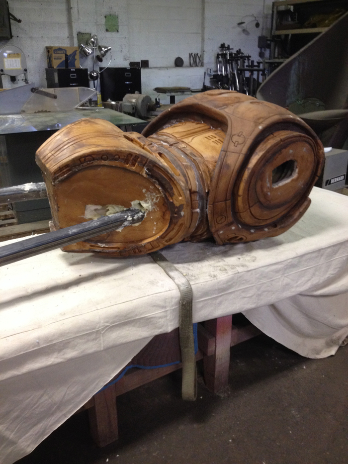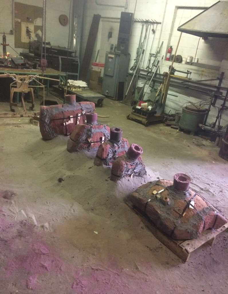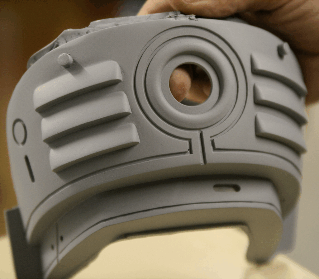 The Imagination Station team created a Kickstarter around the idea of 3D scanning a RoboCop action figure, enlarging it to 6’, and pouring it in iron. How hard could it be? Well! From there things took on a life of their own and the project grew in scale and reach. Omni Consumer Products, a real-life company that shares its name with the fictional megacorporation from the Robocop movie, donated funds, effort and ideation. John Leonard created a viral Facebook page bringing in additional interest, and all of this activity invited a lively national conversation. As the team worked on a path forward, the idea evolved – from iron to bronze, and from 6’ in height to 10’. Mark Dubeau from Tippett Studio (yes, that Tippett Studio – the one that makes Jurassic Park dinosaurs and Star Wars creatures) was able to access the original pieces of armor from the movie, which were being stored in a warehouse in Houston. He performed a painstaking, multi-year sculptural restoration. Exhaustive research was done to ensure the accuracy of the work, and many greebles were re-crafted as part of the process to ensure fidelity. The restored pieces were passed off to Fred Barton Productions and 3D scanned for enlargement. CNC milling from the scans produced a 10′ high-density polyurethane foam model, which was to be cast when the team could find a foundry to do the work. A 14-plus-year journey of numerous chapters lay ahead – although it was not clear it would take that long at the time.